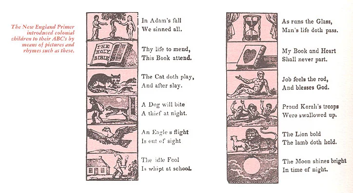 I believe what Miss Bates wanted us to see in her hymn was that America’s physical beauty should call us to moral beauty. This is what she means, perhaps, by and crown thy good with brotherhood. And moral beauty is possible only through our souls being confirmed in self-control, our liberty in law, with all success nobleness, and every gain divine. The author rooted her meditation in the moral path of the feet of stern Pilgrims. The Pilgrims' basis for everything was the law of God in the Bible. Confirm thy soul in self-control, thy liberty in law, did not mean natural law or man-made laws, but God’s law, the Bible. In 1784 most New England children learned their ABC’s by reading the New England Primer below.